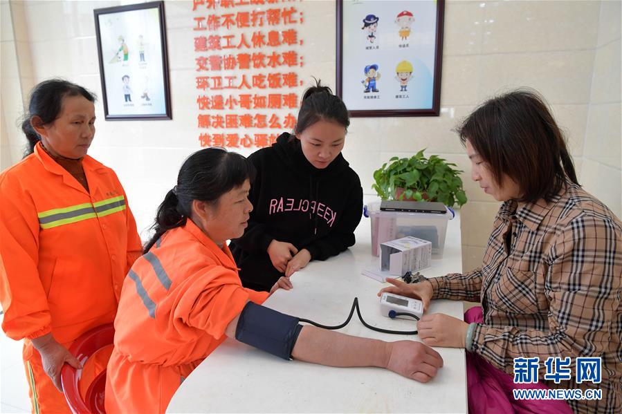 12月17日,在江西省南昌市西湖区桃花镇工会户外劳动者驿站,几名环卫工人在休息时间测量血压。新华社记者 彭昭之 摄
