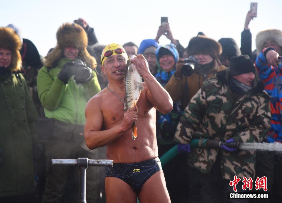 12月18日,一名冬泳游客手捧刚捕上岸的鱼留影。当日,新巴尔虎左旗第三届诺干湖渔猎文化活动暨2019“银色巴尔虎”冬季旅游大幕在内蒙古自治区呼伦贝尔市新巴尔虎左旗开幕,鱼把头在-40℃的低温下开渔冬捕。 中新社记者 张玮 摄