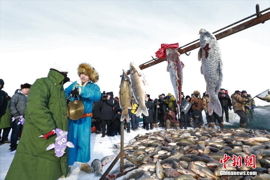 12月18日,诺干湖冬捕上岸的鱼进行现场拍卖。当日,新巴尔虎左旗第三届诺干湖渔猎文化活动暨2019“银色巴尔虎”冬季旅游大幕在内蒙古自治区呼伦贝尔市新巴尔虎左旗开幕,鱼把头在-40℃的低温下开渔冬捕。 中新社记者 张玮 摄
