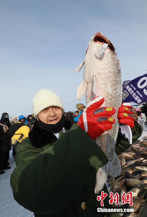 12月18日,一名游客在冬捕现场拍得达17斤头鱼。当日,新巴尔虎左旗第三届诺干湖渔猎文化活动暨2019“银色巴尔虎”冬季旅游大幕在内蒙古自治区呼伦贝尔市新巴尔虎左旗开幕,鱼把头在-40℃的低温下开渔冬捕。 中新社记者 张玮 摄