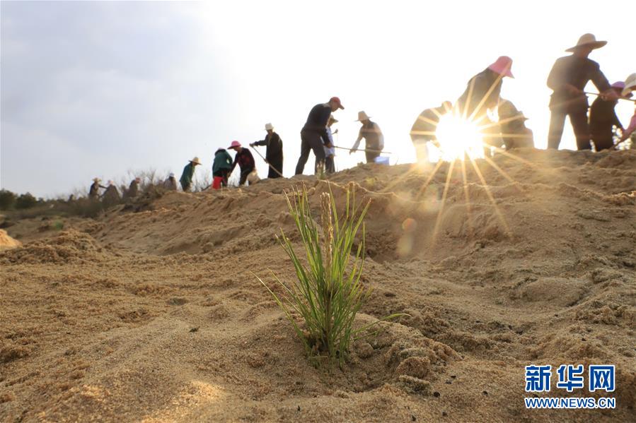 江西庐山市蓼南乡组织村民在长江流域鄱阳湖畔的沙洲上种植瞿麦。瞿麦是一味中药材,不仅有固沙绿化作用,还具有较高的经济价值(4月12日摄)。新华社发(韩俊烜 摄)