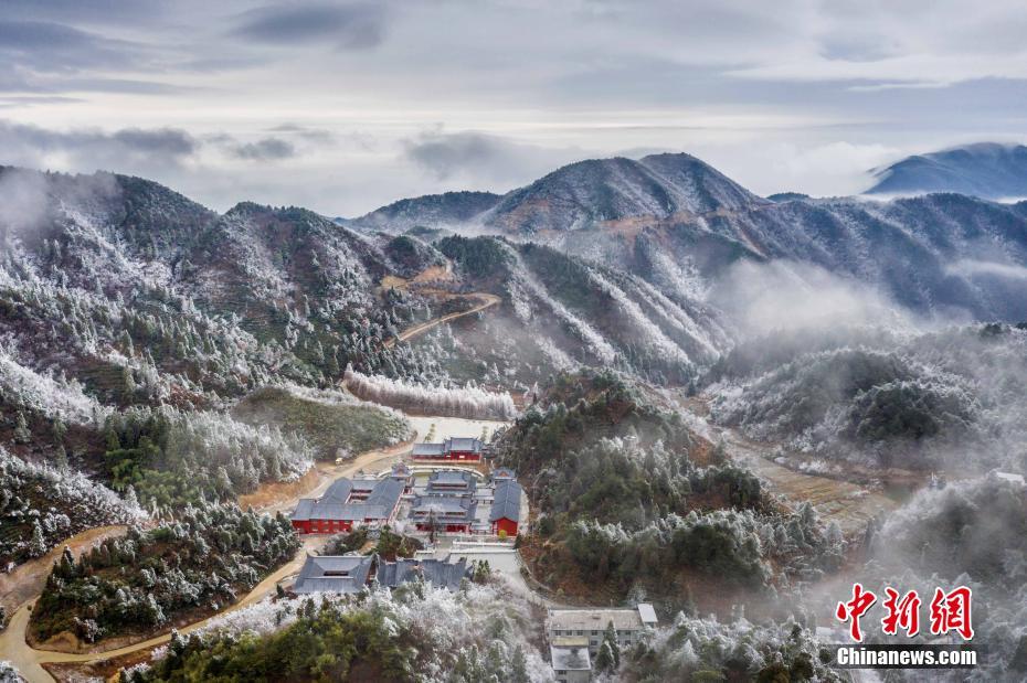 航拍江西武宁县太平山下的佑圣宫,在雾凇景观的衬托下,犹如仙境。 罗鑫钢 摄