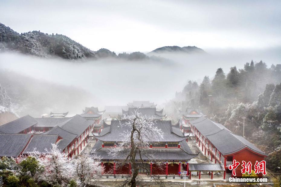 航拍江西武宁县太平山下的佑圣宫,在雾凇景观的衬托下,犹如仙境。 罗鑫钢 摄
