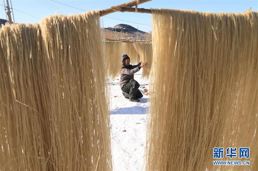 12月20日,河北省唐山市丰润区火石营镇西珠峪村村民在晾晒粉条。 寒冬时节,在河北省唐山市丰润区火石营镇西珠峪村,农民们忙着加工晾晒粉条供应市场。近年来,西珠峪村通过运用“合作社+农户”的模式,打造具有特色的粉条产业,成为了当地远近闻名的“粉条加工专业村”,实现冬闲增收。 新华社记者 牟宇 摄