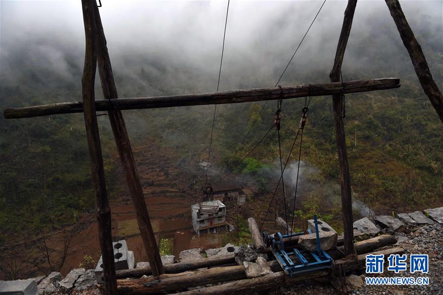 在广西大化瑶族自治县板升乡八好村弄平屯,村民通过吊车将建筑材料运到弄底修建房子( 2015年3月9日摄)。如今弄平屯已经修通公路。新华社记者 黄孝邦 摄