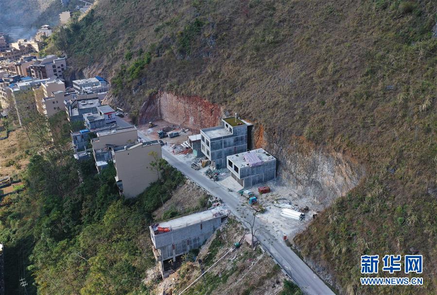 在广西大化瑶族自治县七百弄乡弄合村,从大山深处搬迁出的村民在路边挖出地基,建起新楼(12月17日无人机拍摄)。新华社记者 黄孝邦 摄