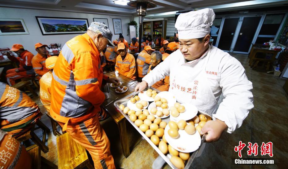 山东海阳一店主冬日请环卫工人吃“摔面” 已坚持6年