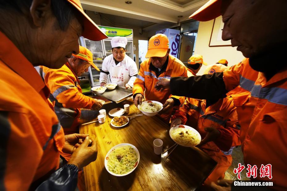 山东海阳一店主冬日请环卫工人吃“摔面” 已坚持6年