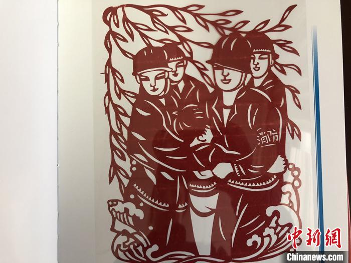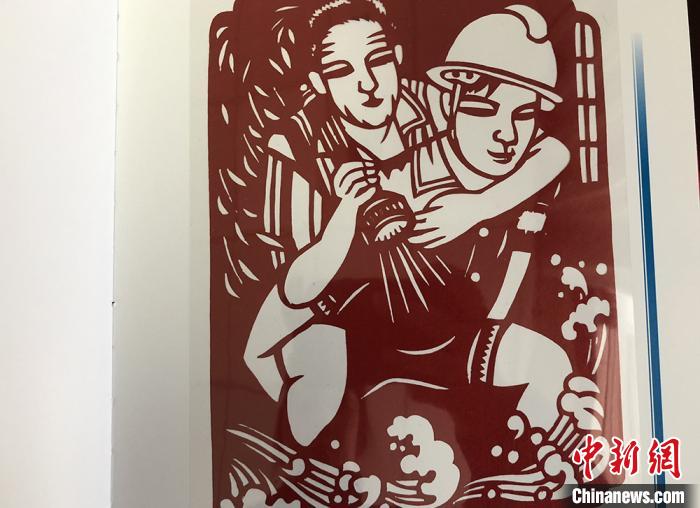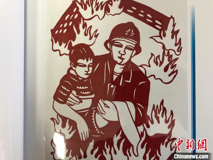图为剪纸作品表现消防员救人场景。 王艺霏 摄