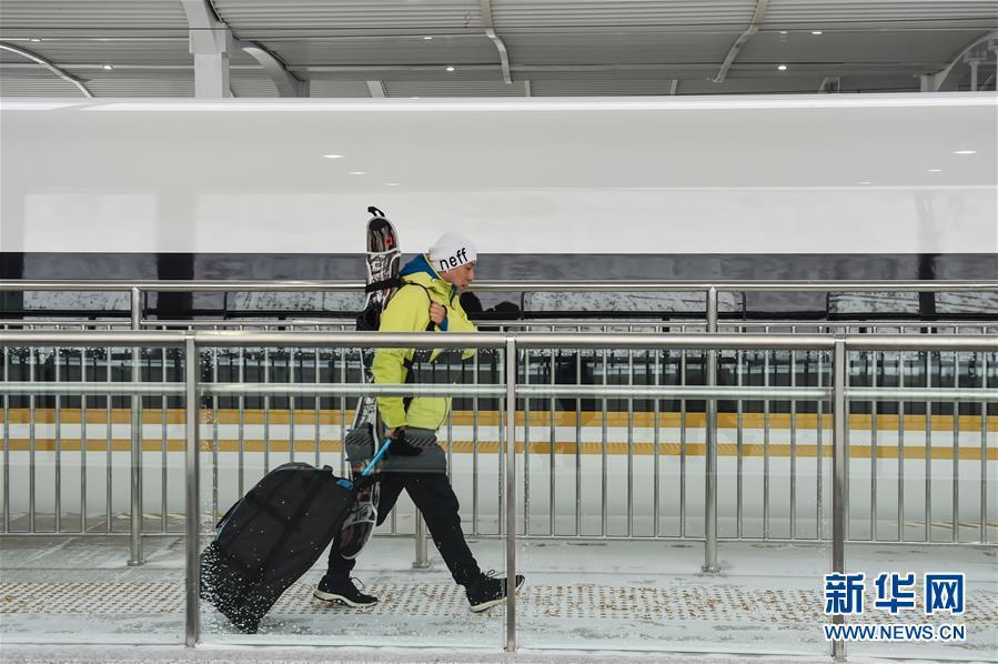 12月30日,G8811次列车抵达崇礼太子城站,一位乘客拖着滑雪装备下车。 当日,北京至张家口高速铁路开通运营,崇礼铁路同步通车。 新华社发 彭子洋 摄 图片来源:新华网