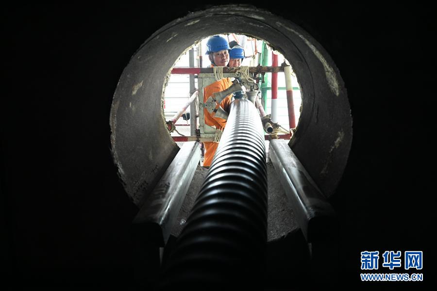 12月30日,福建送变电公司施工人员将电缆送入平潭海峡公铁大桥桥腹箱涵内。新华社记者 林善传 摄
