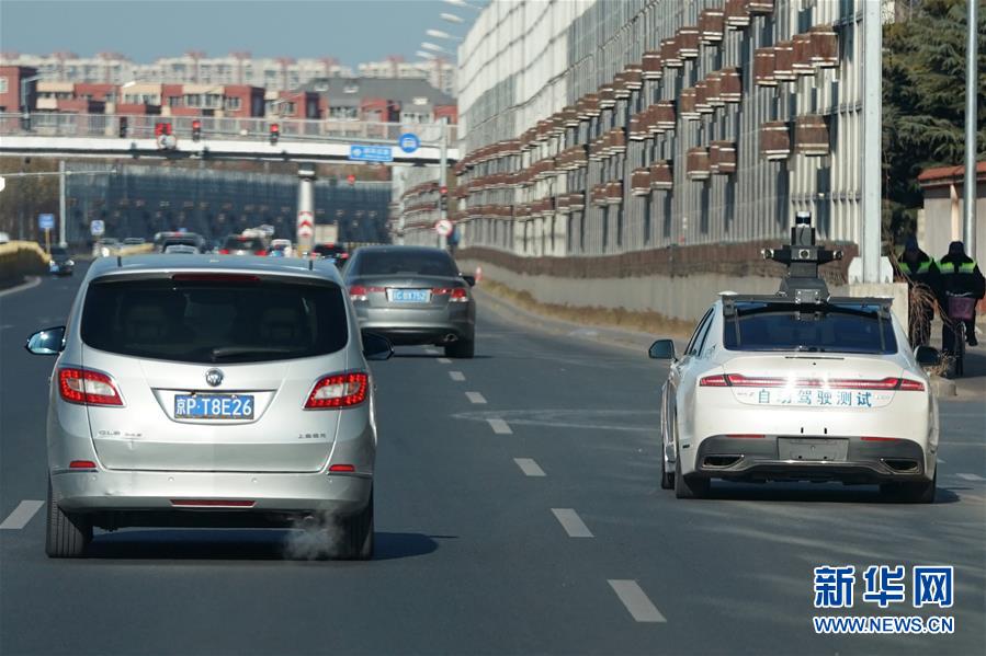 12月30日,一辆进行自动驾驶载人载物测试的汽车(右)行驶在北京经济技术开发区的测试道路上。新华社记者 鞠焕宗 摄