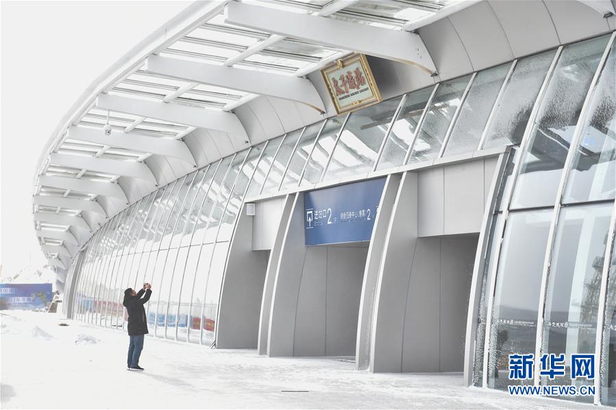 12月30日,G8811次列车抵达太子城站,乘客下车来到太子城站门前拍照留念。新华社发(彭子洋摄)