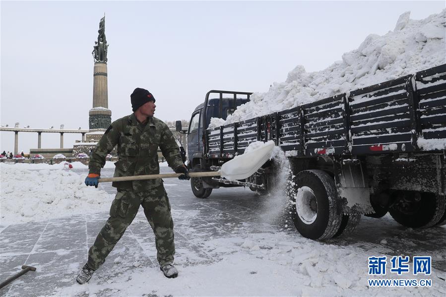 12月30日,哈尔滨市道里区防洪纪念塔广场,工人在清理积雪。新华社发(张涛 摄)