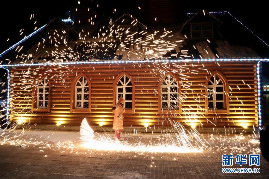 在黑龙江省漠河市北红村,游客在玩转烟花(12月29日摄)。 新华社记者 齐泓鑫 摄