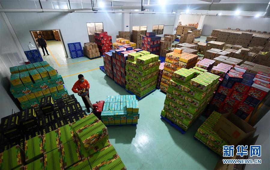 1月2日,在柳州市螺蛳粉产业园螺状元食品有限公司,工人将包装好的螺蛳粉搬进仓库。新华社记者 黄孝邦 摄