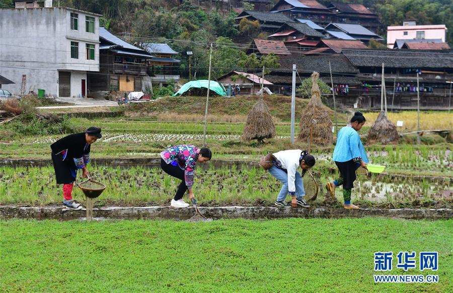 在柳州市融水苗族自治县拱洞乡贫困村——龙令村,村民在螺蛳生产基地打捞螺蛳,准备供应当地螺蛳粉生产企业(2018年11月17日摄)。新华社记者 黄孝邦 摄