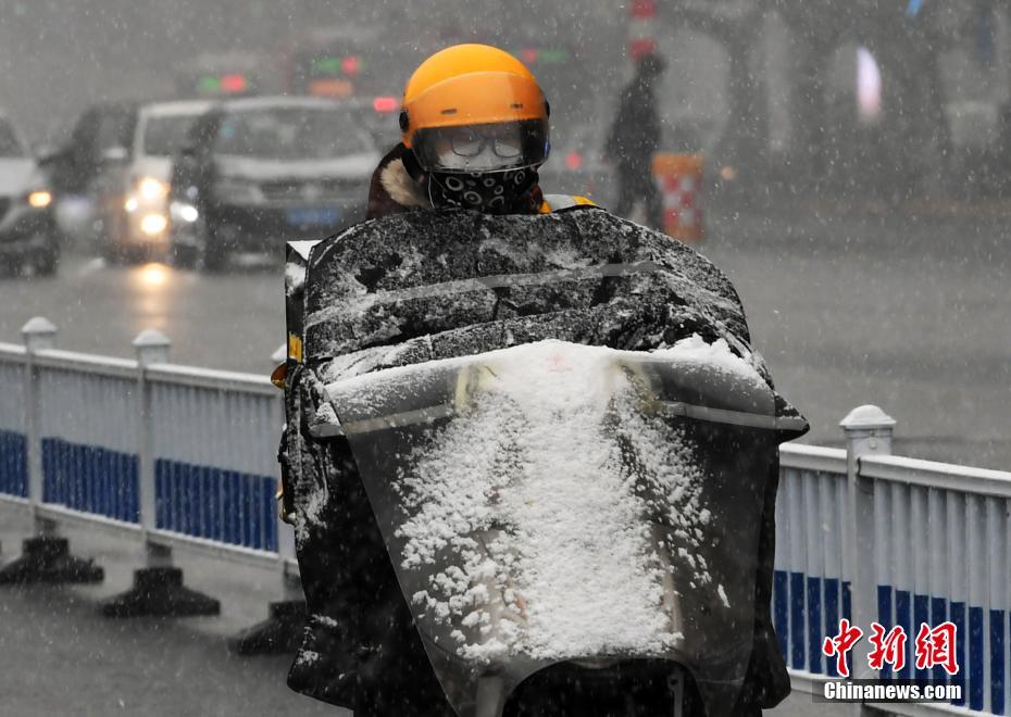 1月5日中午,河北石家庄迎来了2020年的第一场雪。图为市民雪中出行。中新社记者 翟羽佳 摄