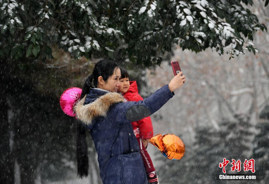 1月5日中午,河北石家庄迎来了2020年的第一场雪。很多市民走向户外,赏雪、嬉戏。图为母女雪中自拍。中新社记者 翟羽佳 摄
