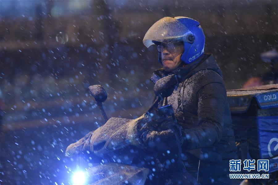 1月5日,在北京市朝阳区街头,外卖送餐员在雪中等候过马路。 当日,北京迎来2020年首场降雪。 新华社记者 鞠焕宗 摄