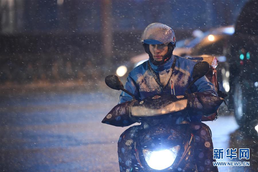 1月5日,在北京市朝阳区街头,外卖送餐员在雪中骑行。 当日,北京迎来2020年首场降雪。 新华社记者 鞠焕宗 摄