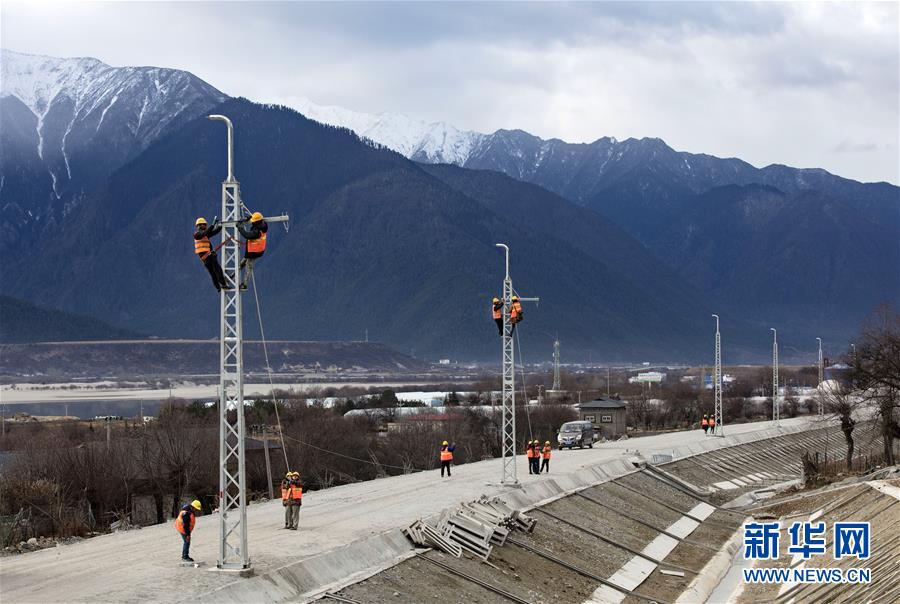 1月3日,在西藏林芝市米林县,中铁电气化局集团西安电化公司工人在进行电气化施工。