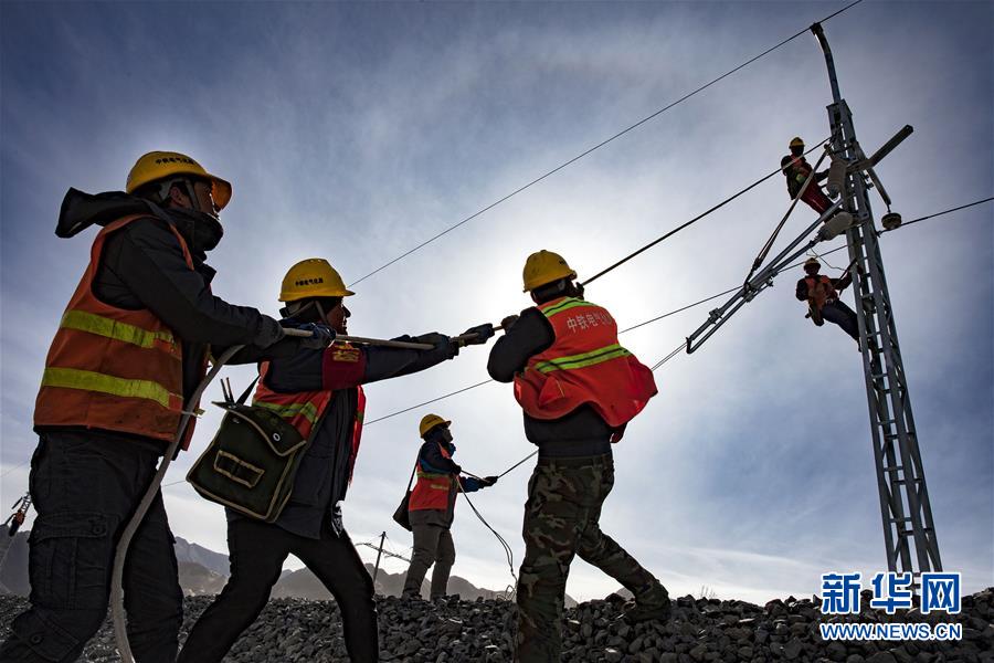 1月1日,在西藏山南市,中铁电气化局集团西安电化公司工人在扎其站至泽当站区间进行电气化施工。新华社发(焦宏涛 摄)