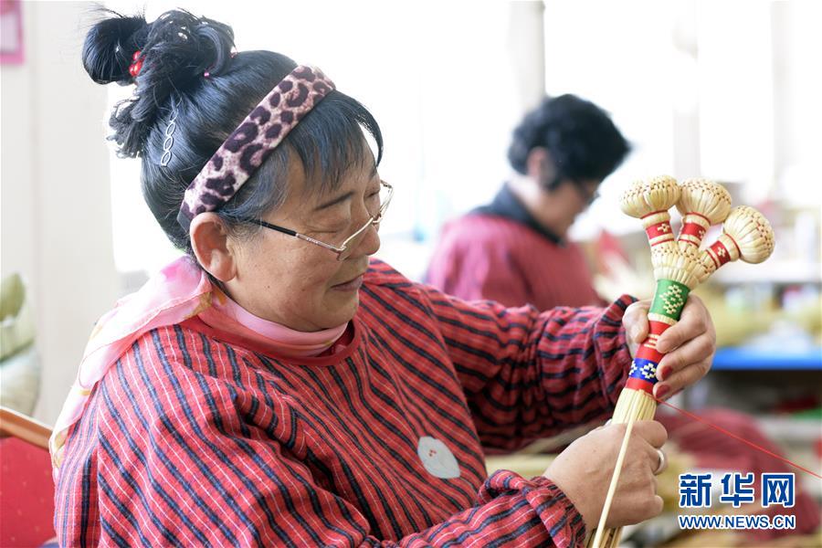 1月4日,工人在一家笤帚苗加工厂制作笤帚苗工艺摆件。新华社发(王正 摄)