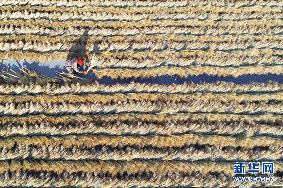 1月4日,工人在一家笤帚苗加工厂晾晒笤帚。新华社发(王正 摄)