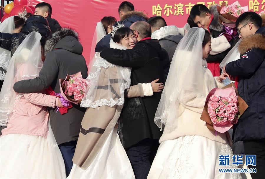 1月5日,在冰城哈尔滨,参加集体婚礼的新人幸福相拥。新华社发(张涛 摄)