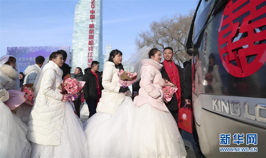 1月5日,在冰城哈尔滨,参加集体婚礼的新人携手离开。新华社发(张涛 摄)