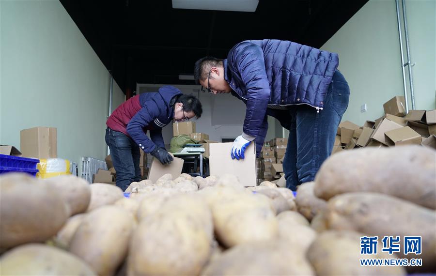 1月5日,工作人员在张家口市万全区电子商务公共服务中心打包土豆。 近年来,河北省张家口市万全区大力发展农村电商产业,网络交易规模不断扩大,当地土豆、燕麦、鲜食玉米、山杏等农产品搭上“互联网+”快车销往全国。目前,万全区扶持发展电商龙头企业30余家,成立线下143个“万全卫道”电商便民服务站,有效带动农民增收,为乡村振兴注入了活力。 新华社记者 牟宇 摄