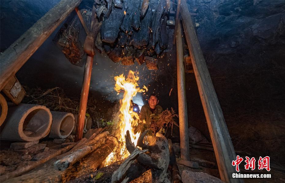1月5日,江西省新余市仙女湖区凤凰湾办事处欧山村村民在独特的山洞里熏制腊味。当地山区村民一直保留着的古法熏制腊肉手艺,将精心腌制好的猪肉、牛肉、羊肉、鱼类、鸡鸭鹅等架置于山洞中,架起柴火熏制数日,为春节餐桌上备上一道特别的美味。 中新社发 赵春亮 摄