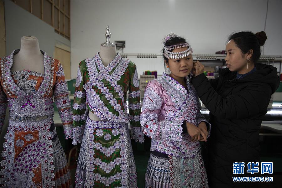 1月6日,在贵州省毕节市黔西县林泉镇高锦社区苗族女青年尤小凤创办的民族服饰加工厂内,顾客(左)前来购买苗族服装。 春节临近,贵州省毕节市黔西县林泉镇高锦社区的民族服饰加工车间内一派繁忙,工人忙着赶制各式苗族服装,供应节日市场。 新华社发(史开心 摄)