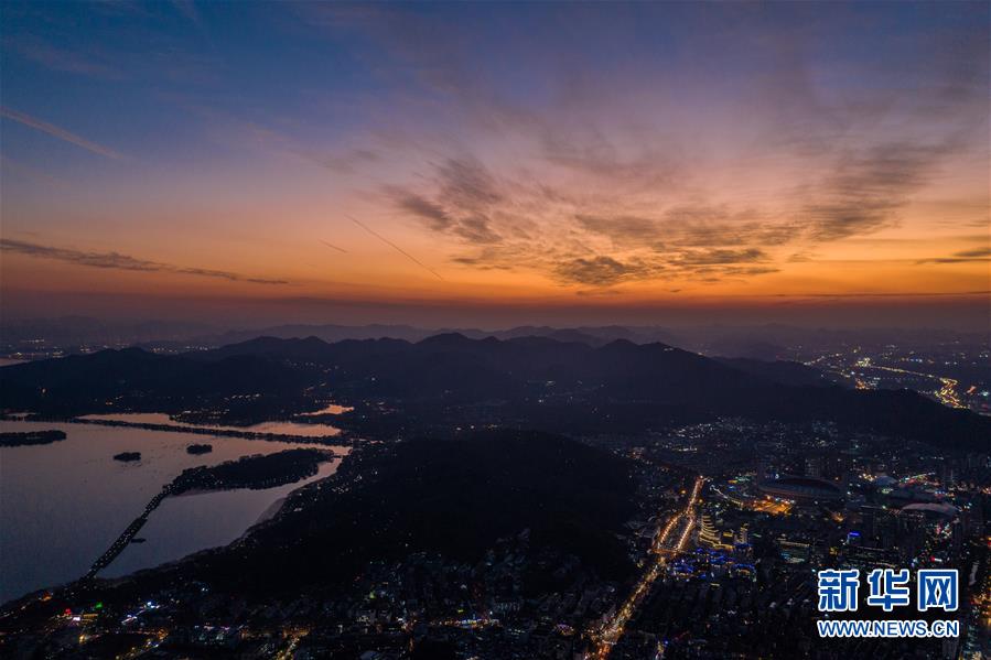 1月6日,杭州城区上空呈现绚丽晚霞(无人机照片)。 新华社记者 徐昱 摄