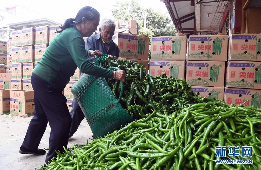 1月6日,钦州市钦南区那丽镇椒农将辣椒倒出。 因气温转暖,广西钦州市钦南区那丽镇群众种植的冬辣椒比往年提前2个月上市。目前,当地群众正抓紧抢收辣椒以供应市场。2019年那丽镇冬辣椒种植面积约1.6万亩。 新华社记者张爱林摄