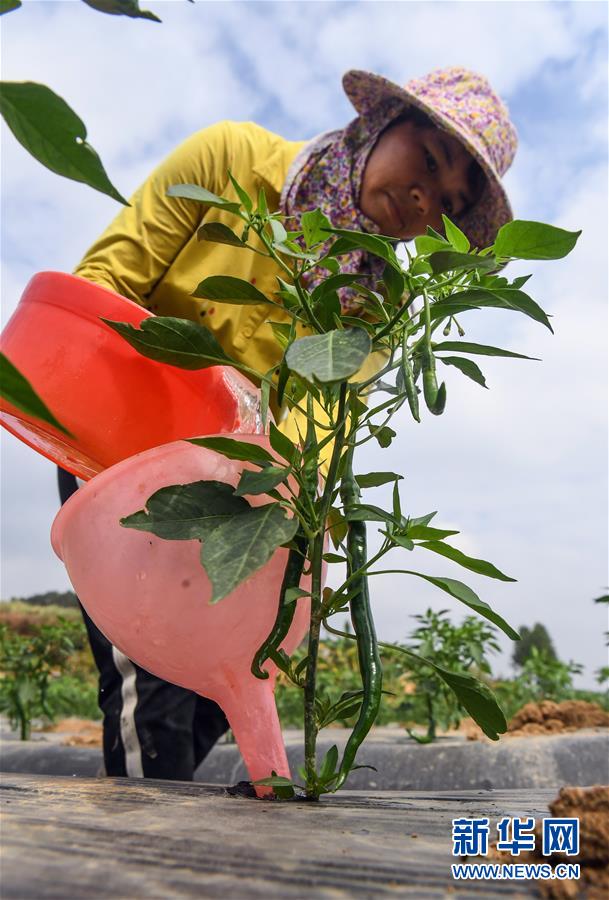 1月6日,钦州市钦南区那丽镇的一名椒农在给辣椒浇水。 因气温转暖,广西钦州市钦南区那丽镇群众种植的冬辣椒比往年提前2个月上市。目前,当地群众正抓紧抢收辣椒以供应市场。2019年那丽镇冬辣椒种植面积约1.6万亩。 新华社记者张爱林摄