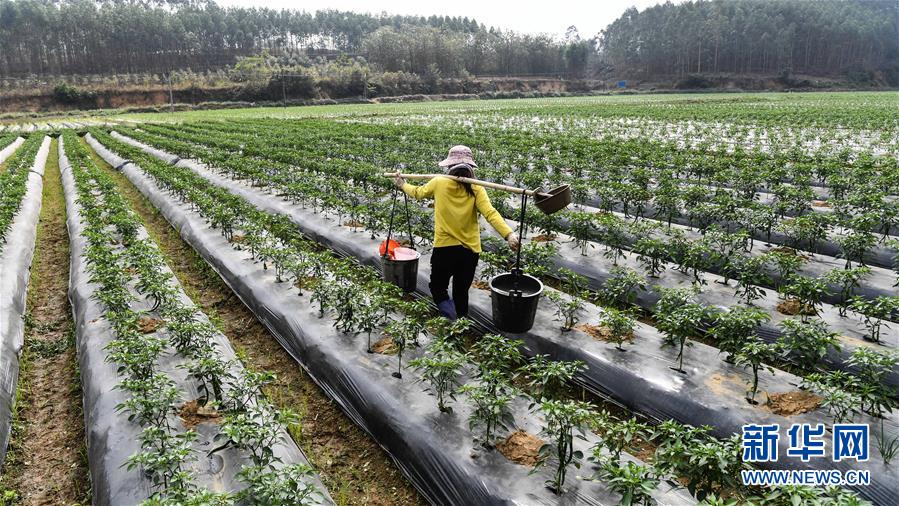 1月6日,钦州市钦南区那丽镇椒农在护理辣椒园。 因气温转暖,广西钦州市钦南区那丽镇群众种植的冬辣椒比往年提前2个月上市。目前,当地群众正抓紧抢收辣椒以供应市场。2019年那丽镇冬辣椒种植面积约1.6万亩。 新华社记者张爱林摄