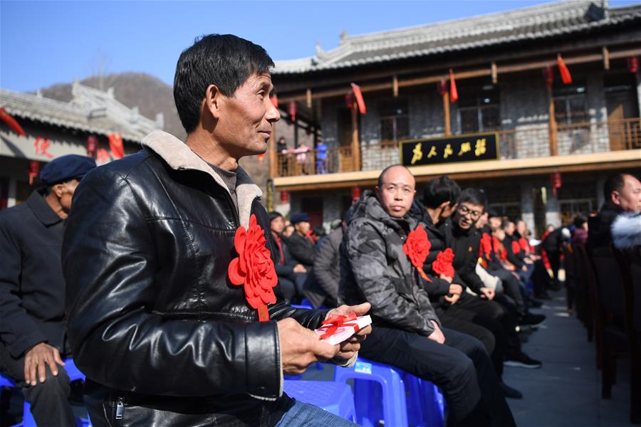 1月7日,村民康耀林(前)在分红大会上领到分红。 新华社记者 陈斌 摄