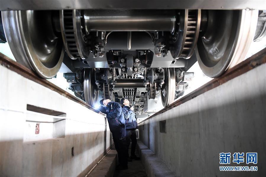 1月7日,铁路员工在对CR200J动车组列车的车轮和车轴进行检测维护。新华社记者 唐奕 摄