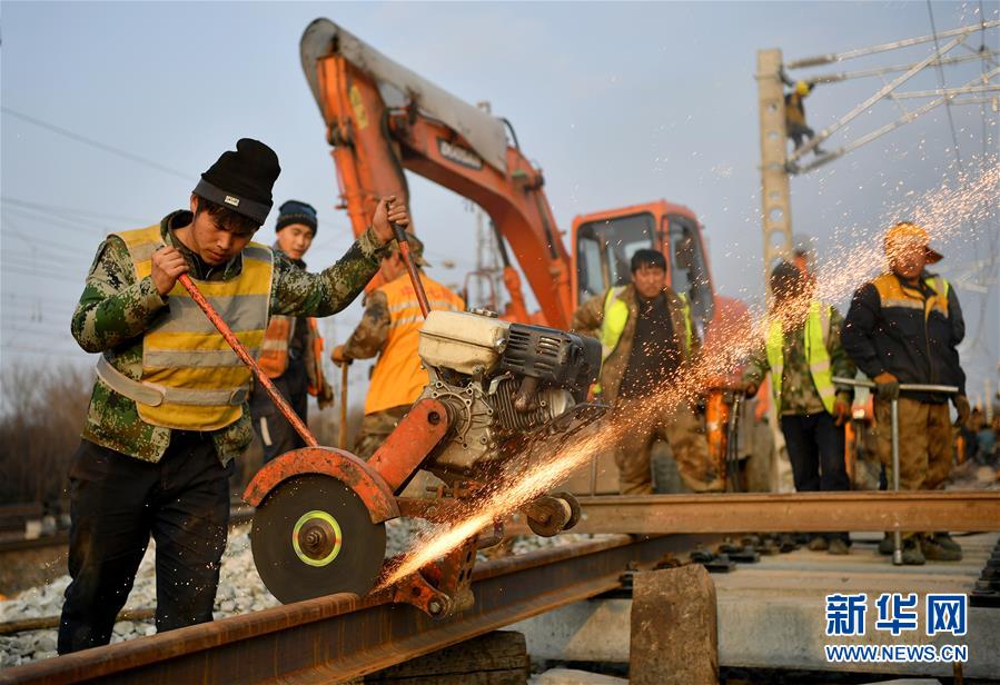 1月7日,中铁七局的铁路建设者在切割钢轨。 当日,在西安市临潼区新丰镇,西安火车站站改扩建工程新丰至窑村段增建二线线路,在中铁七局千余名铁路建设者的奋战下全线贯通。该线路全长23.1公里,开通后将有效缓解全国铁路重要枢纽——新丰镇车站的紧张状态、扩充陇海线运能、畅通入川货运通道、缓解北煤南运压力,为即将开始的春运提供保障。 新华社发(韩正阳 摄)
