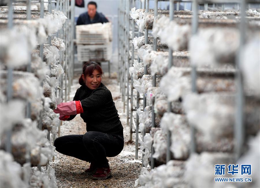 1月7日,卢氏县范里镇新庄村的村民在大棚内摆放香菇菌棒。 临近农历新年,河南省卢氏县范里镇新庄村的村民抓紧时间将培育好的香菇菌棒上架,以供应春节市场。 新华社记者李嘉南摄