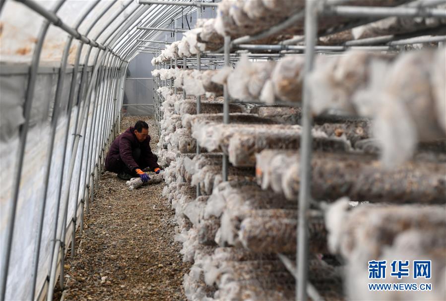 1月7日,卢氏县范里镇新庄村的村民在大棚内摆放香菇菌棒。 临近农历新年,河南省卢氏县范里镇新庄村的村民抓紧时间将培育好的香菇菌棒上架,以供应春节市场。 新华社记者李嘉南摄