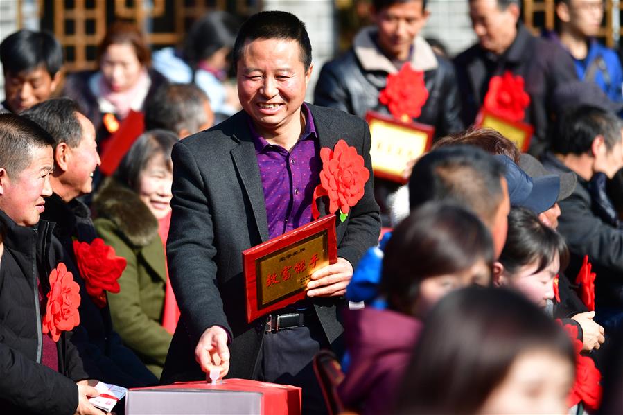 1月7日,村民尹新平在分红大会上领到“致富能手奖”。 新华社记者 陈斌 摄