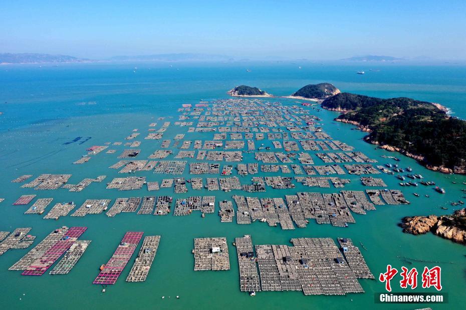 1月8日,在福建连江东洛岛海域上,绵延数公里的渔排上养殖着鲍鱼,渔排上搭建的木屋错落成“户”,成为一个飘浮在一个海上的村庄,蔚为壮观。张斌 摄