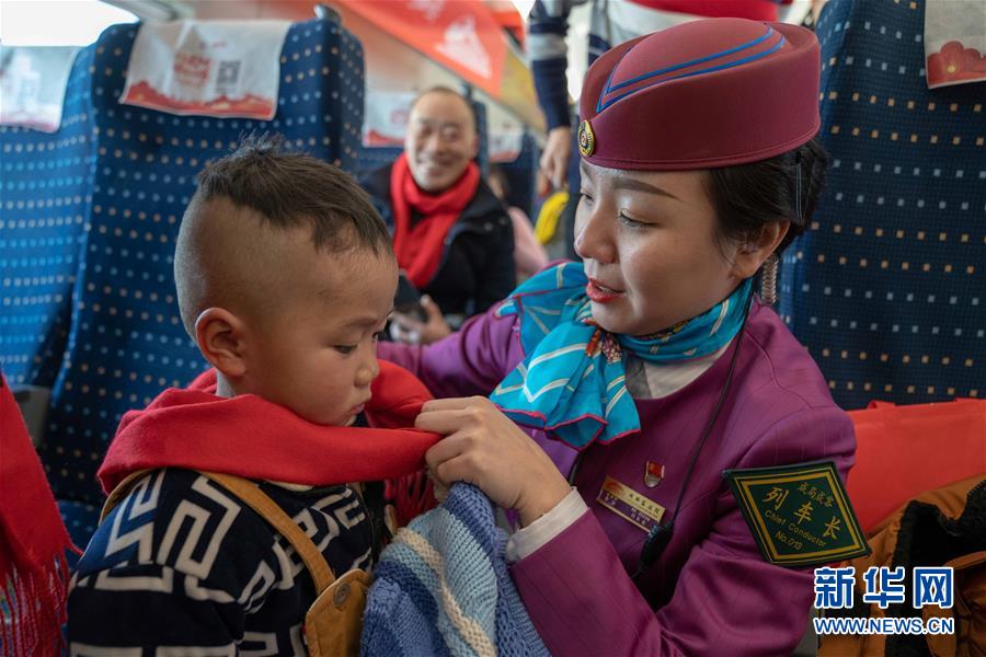 1月8日,在由北京西开往成都东的G307次“川籍农民工春节专列”上,乘务员为一名儿童整理围巾。 当日,一列由北京开往成都的“川籍农民工春节专列”从北京西站开出,载着700余名川籍农民工及家属返乡过年。此公益活动面向川籍农民工聚集的北京、上海、福建、江苏、江西,共征集约2400名川籍农民工及家属,分别从这5省市免费载他们返乡过年。 新华社记者 薛晨 摄