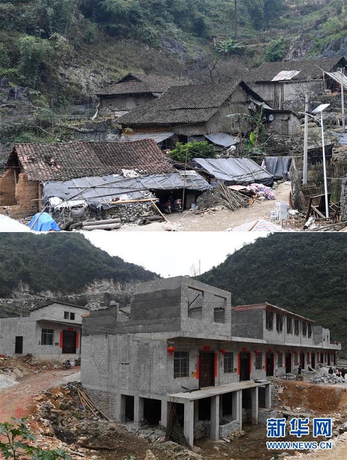 这张拼版照片显示的是:1月8日拍摄的广西都安瑶族自治县龙立屯部分危旧住房(上图)和新建的村民新居(下图)。 广西都安县三只羊乡平花村龙立屯是一个深度贫困人口聚居屯,全屯12户村民的房屋主要以木瓦、土坯结构为主,年久失修。2018年12月,当地党委政府对全屯住房进行统一规划和建设,以改善村民居住条件。新春佳节临近,村民陆续搬入新居。 新华社记者 陆波岸 摄