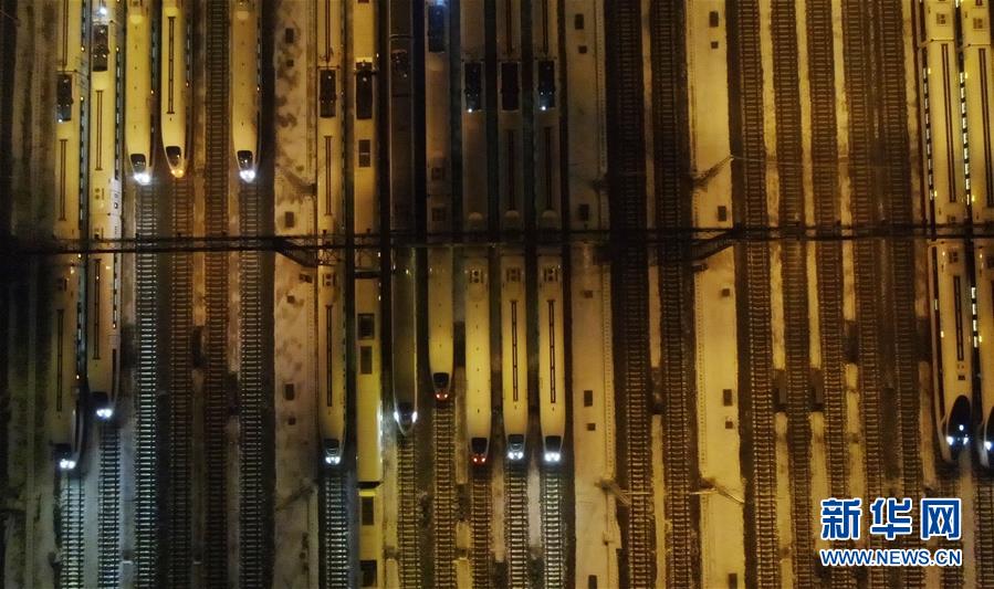 1月8日,在沈阳动车段沈阳北动车运用所存车线,检修整备好的动车组列车整装待发(无人机照片)。 2020年春运临近,中国铁路沈阳局集团有限公司沈阳动车段沈阳北动车运用所加强对动车组列车的检修整备工作,为即将到来的春运做好准备。 新华社记者 杨青 摄