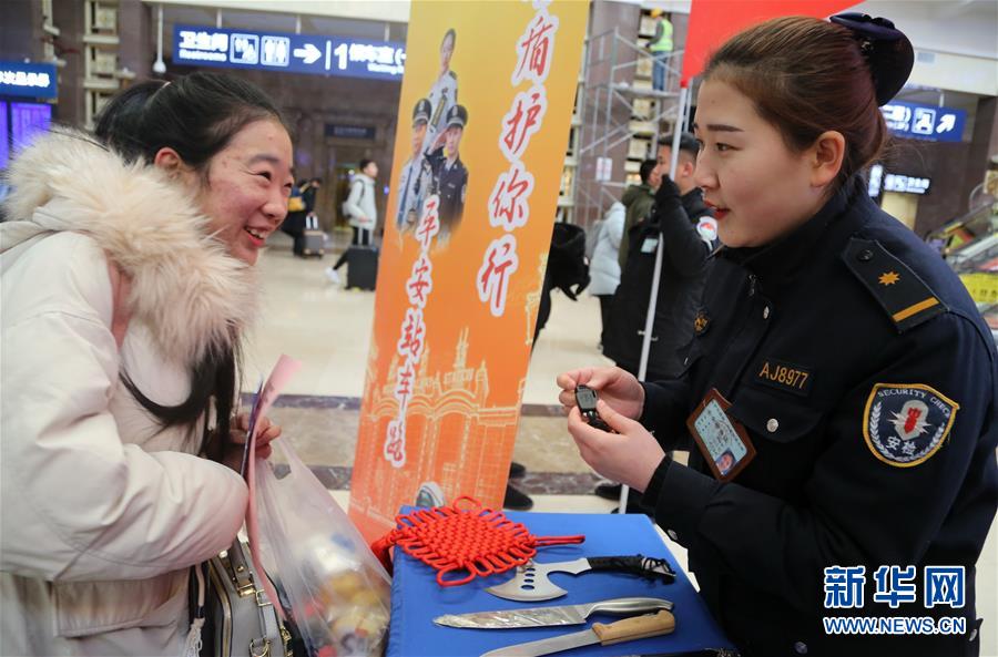 1月9日,北京火车站的安检人员在为旅客讲解出行携带物品知识。 在“110宣传日”来临之际,北京铁路公安处北京站派出所举行春运平安出行宣传活动,为旅客讲解110报警、安检查危、防盗防骗、反恐防暴等出行安全知识。 新华社记者李欣摄