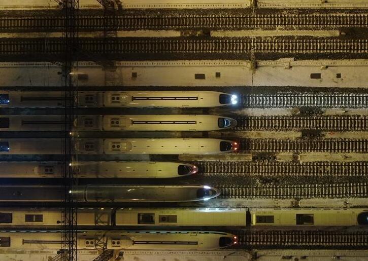1月9日夜晚,动车组机械师在被誉为动车组“体检医院”的南昌西动车组运用所,对一列列“子弹头”动车组列车进行检修。刘占昆 摄